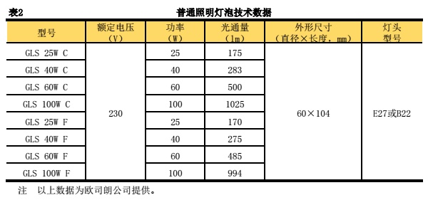 使用E27灯头及使用B22灯头的普通照明灯泡的主要参数见表1及表2。