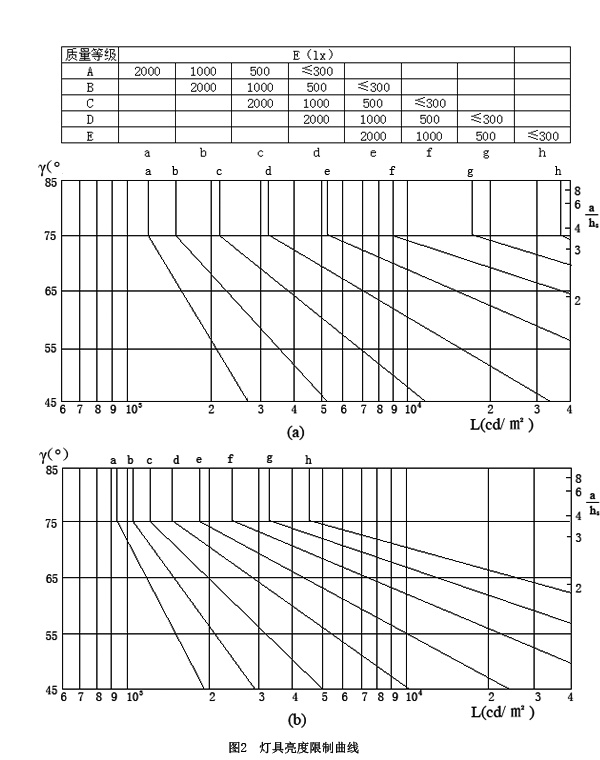 图2(a)中的曲线适用于评价无发光侧面的所有灯具及从纵向观看,有发光侧面的长条形灯具的眩光。图2(b)中的的曲线则适用于评价有发光侧面的所有非长条形灯具,以及从横向观看,有发光侧面的长条形灯具的眩光。长条形灯具是指它的发光面长宽比大于2:1的灯具。
