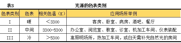 我国照明设计标准按照CIE的建议将光源的色表分为三类,并提出典型的应用场所(参见表3)。